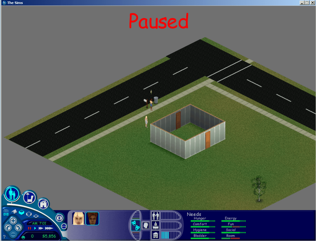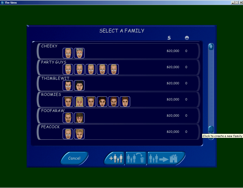After loading the game I found not of the lots were accessible or even recognisable, clicking on them did nothing and no lot information data would appear. When I clicked on the family bin icon however I could see the two unoccupied families from the console version, the heads and faces looked to be missing and the game has loaded the default templates. Understandable since the console sims are in an incompatible 3d format, I’m surprised the game didn’t crash outright.