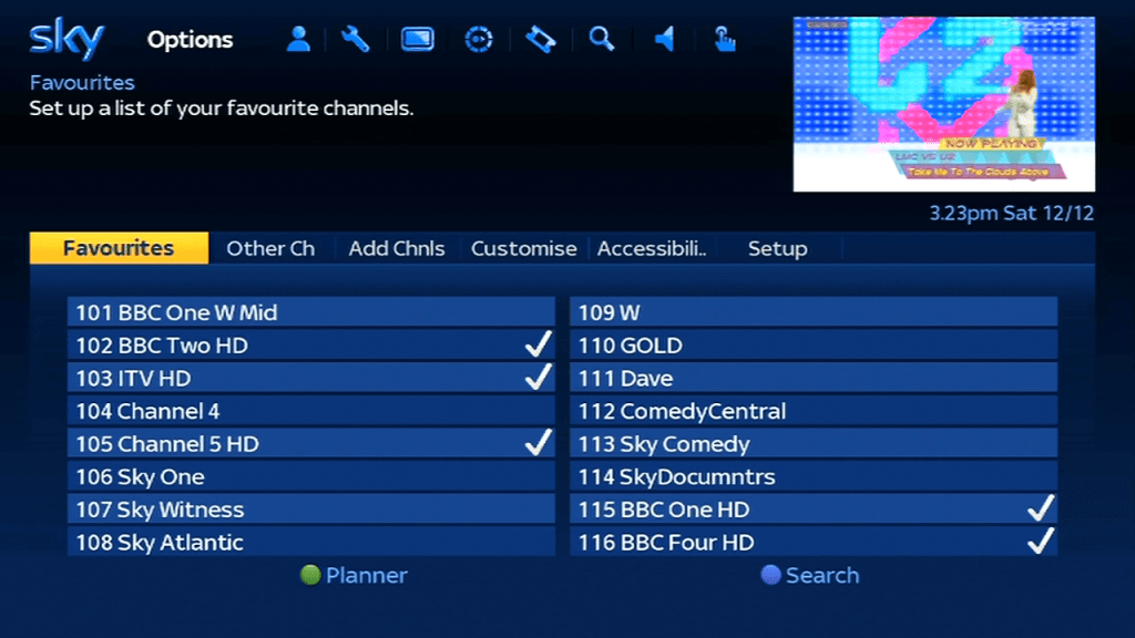 Non EPG channels can be added and view through the options menu, here you can see now and next listings only, and can save up to 50 channels. This is useful to add local tv channels, alternative ITV and Channel 4 regions or services that are testing on Sky.