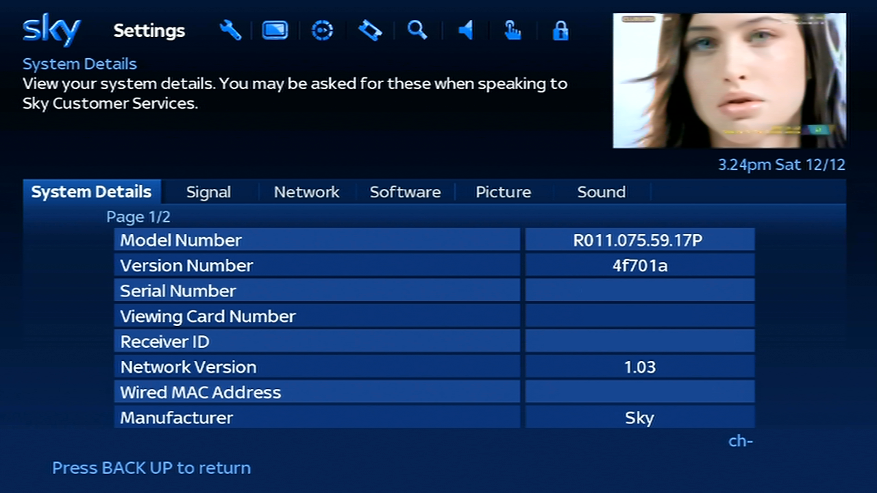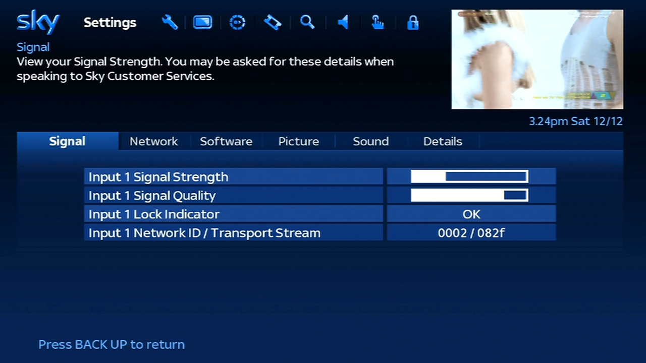 Signal – Checks the signal levels, unlike the old Sky guide this display’s information for the current channel you are tuned to, rather than the default transponder