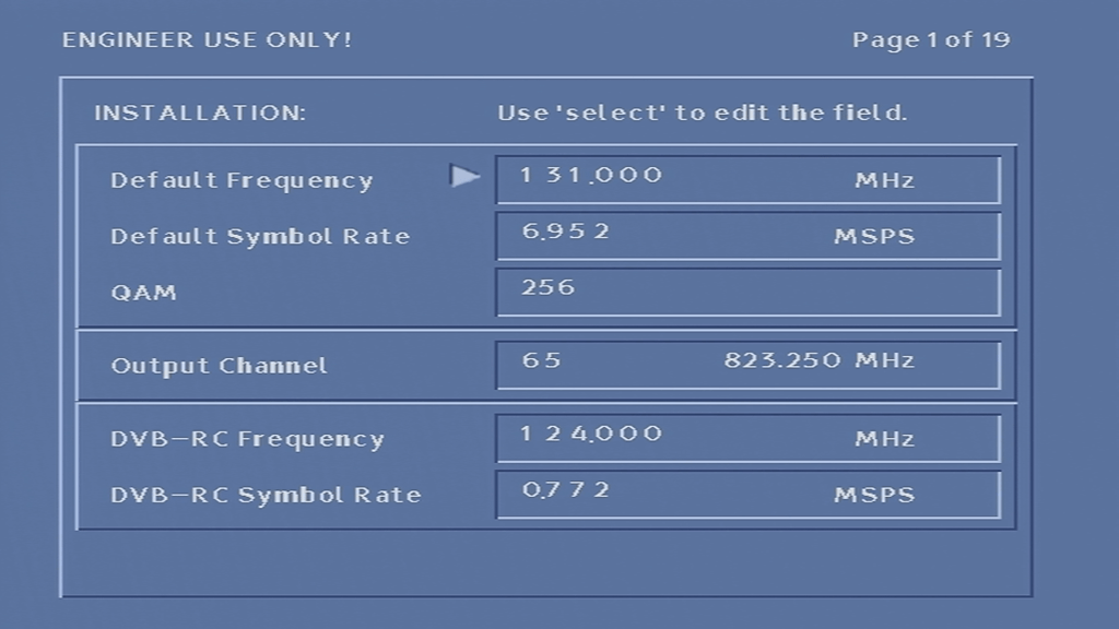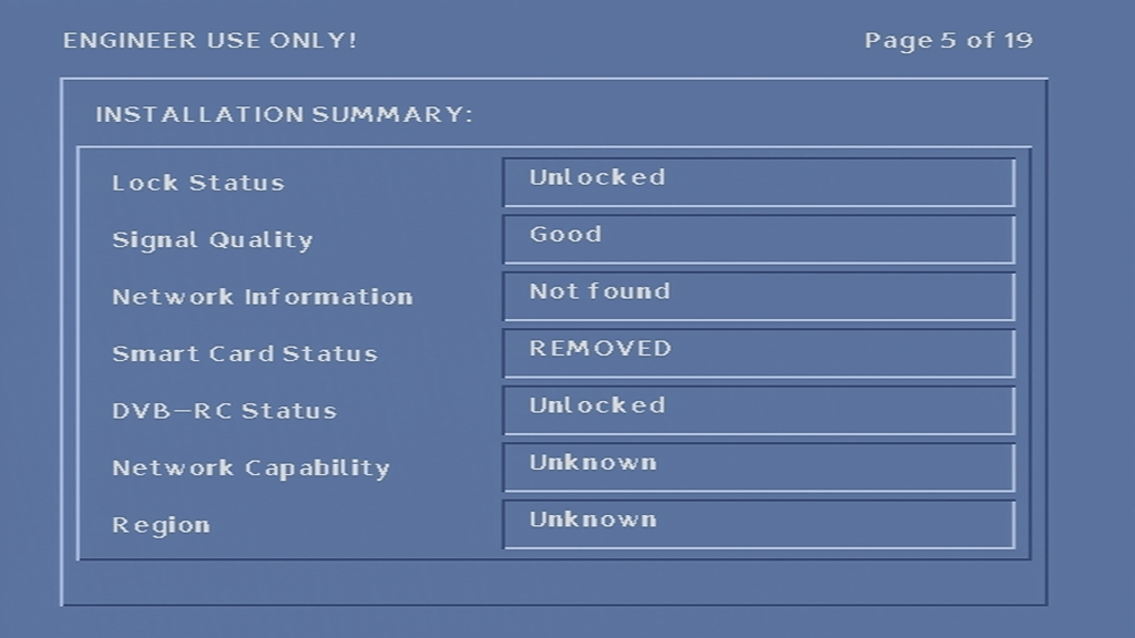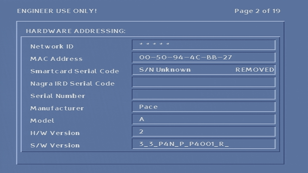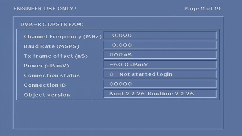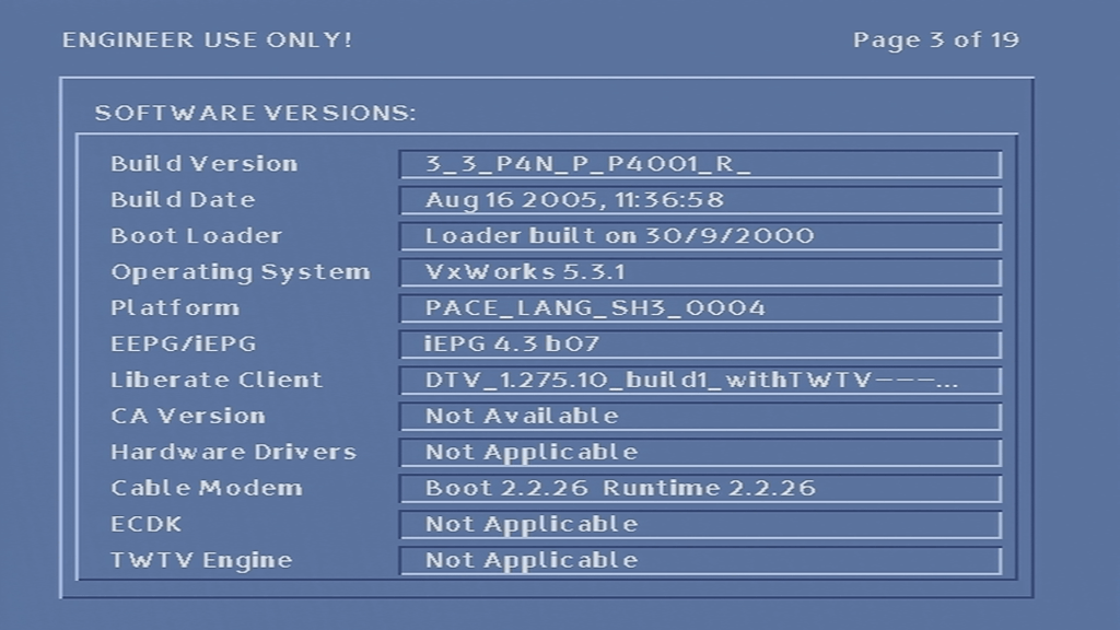 Unfortunately I was unable to get the box to tune into any frequency, never-mind booting with some sort of TV guide. At first I assumed it was because the network information Virgin Media broadcast in my area was not in a compatible format, or that the box was looking for something that Virgin have since removed from the stream, however I am now convinced that the tuner in the box is most likely faulty, since entering correct frequency’s in the engineer screen yields no change to the signal levels, even after removing and reapplying the coax cable.