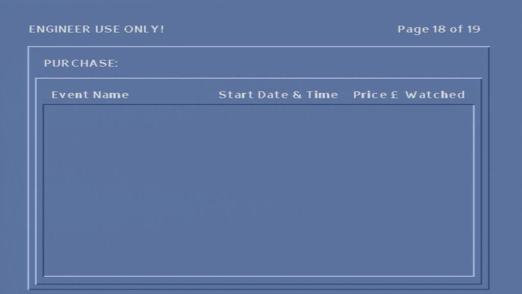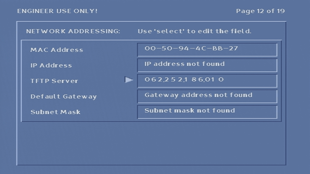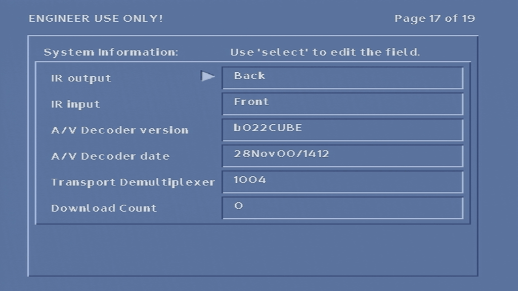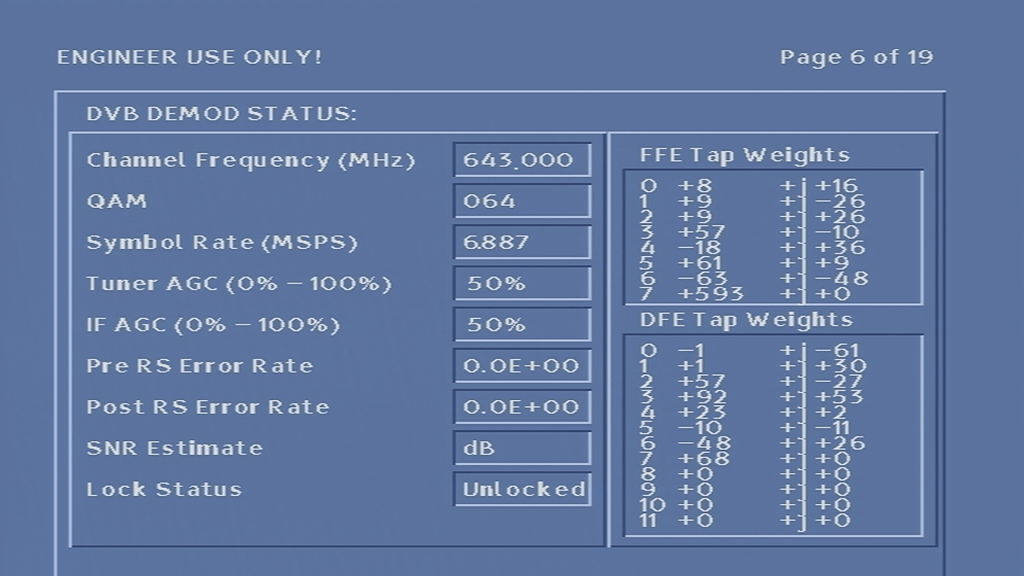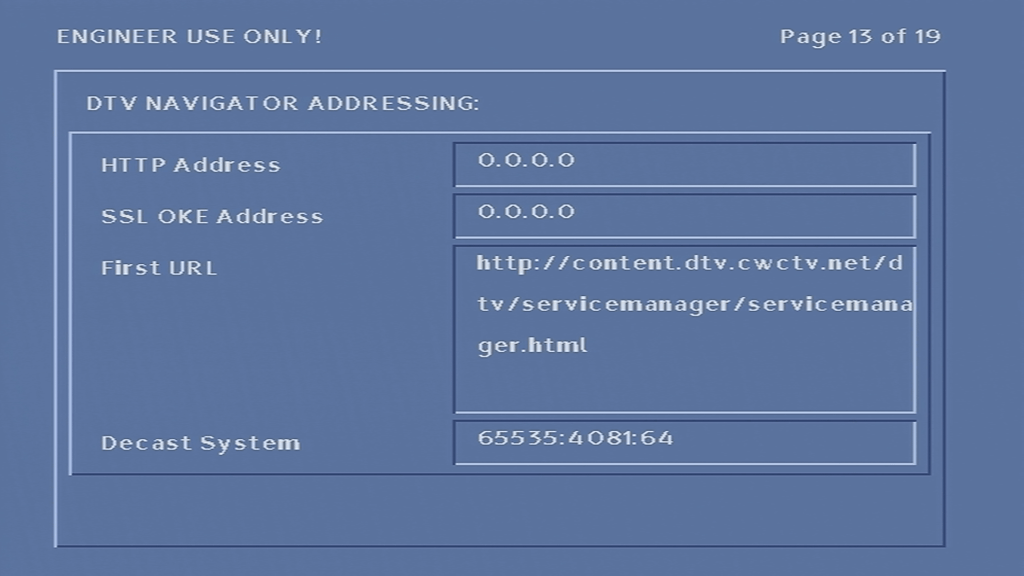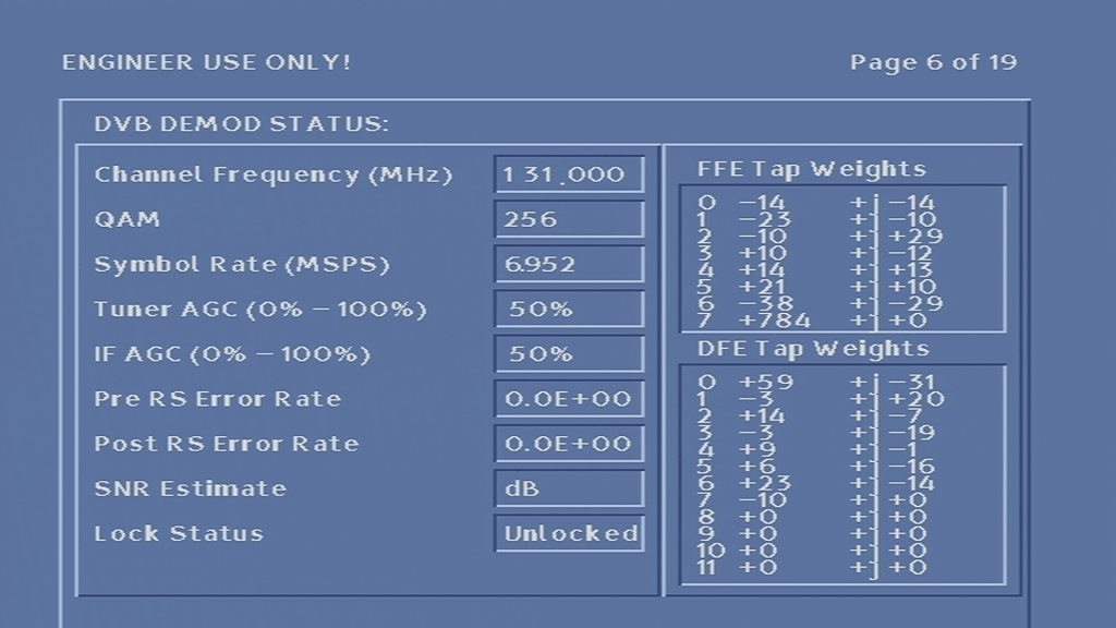 Unfortunately I was unable to get the box to tune into any frequency, never-mind booting with some sort of TV guide. At first I assumed it was because the network information Virgin Media broadcast in my area was not in a compatible format, or that the box was looking for something that Virgin have since removed from the stream, however I am now convinced that the tuner in the box is most likely faulty, since entering correct frequency’s in the engineer screen yields no change to the signal levels, even after removing and reapplying the coax cable.