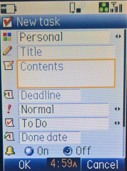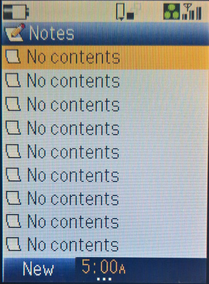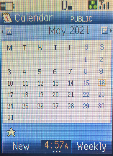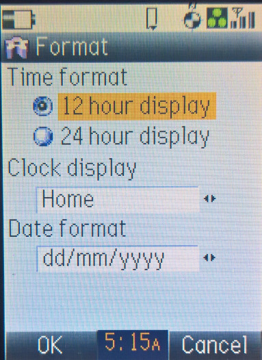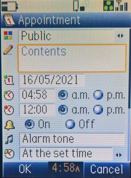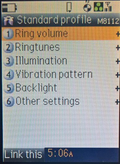 The default home screen, the calendar can be set as the background, or the wallpaper can be displayed instead. The row of icons can be accessed by pressing the middle enter key, which acts as a shortcut bar or dock to access common phone functions. Items can be added here by pressing ‘Link this’ when you are in a menu.
