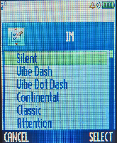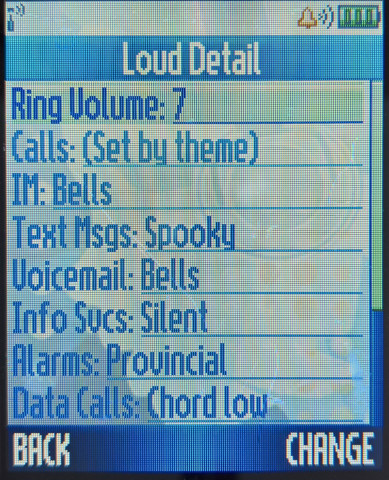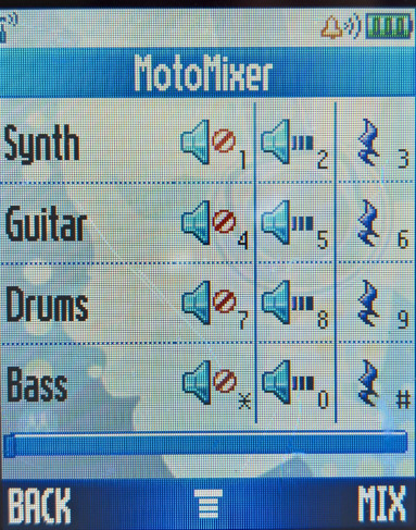Profiles can be set here, default ones to choose from are Loud, Soft, Vibrate, Vibrate and Ring and Silent. Pressing detail will let you customise the profile and set alert tones for various different features of the phone (Calls, IM, SMS, VoiceMail, Alarms, Data calls, etc) Ringtones are in MP3 or Midi format, and Motomixer created ringtones will also show up here.