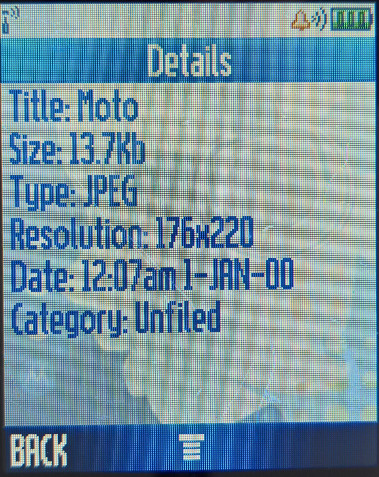 The handset uses a VGA camera, the viewfinder supports zoom and brightness adjustment. Annoyingly photos captured aren’t automatically saved, you have to manually select save. This ties into the phones design, since Motorola intend for you to take a and send photos without the intention of saving them, the phone having only 5Mb of memory adds weight to this theory and the fact the phones presents the option to send first, before saving.