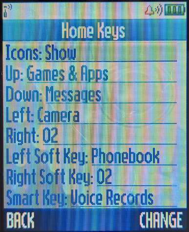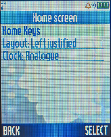 Settings like the home screen layout, which include the function of the home shortcut keys, and the left/right soft keys. The clock type can also be set here.