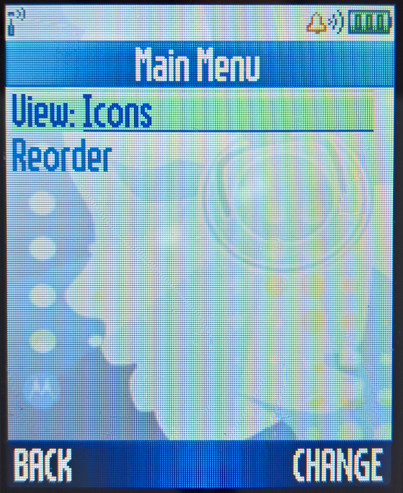 The main menu can be configured as either an icon grid view or a list view, and the menu order can be reordered.