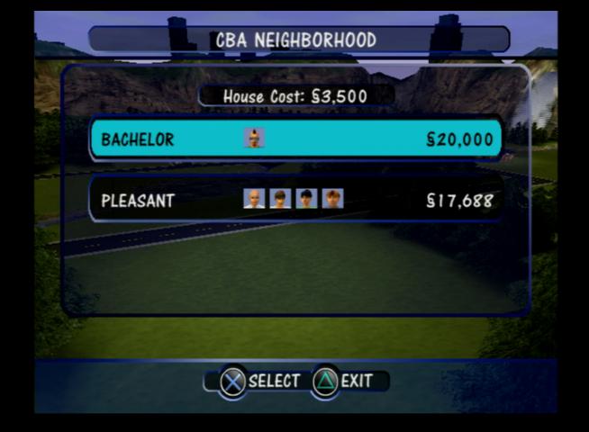 The main screen that shows the playable lots in the neighbourhood, clicking on a house will load that lot. The first game supported only one neighbourhood, with multiple ones requiring an expansion pack. The default install ships with five pre-made families and six houses.