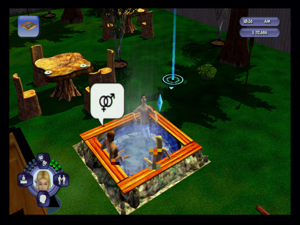Pixel Acres: A nudist colony, bet you’d never thought you would see this on The Sims. Thankfully the sim themselves are censored. A gripe with this levels is there’s near to no fucking rooms! That means if you purchase a TV or a stereo , ensure it is turned off otherwise it will wake your sim, since it and the sims beds are in the same room (Outside, which the game considered to be one large room). Also make sure you hire a maid, or ensure you clean up after your sim since dirty plates will cause the room score to plummet. Honestly this is one of the worst levels of the game since there are little rooms built. I ended up building a small hut just for my sim and partner. Chase and Ying were left outside however, if they choose to live like that that’s their choice.