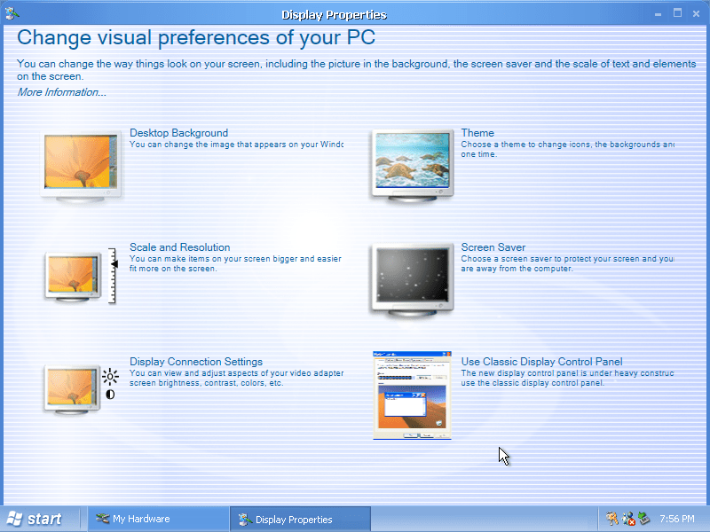 The display properties has been overhauled and contains more user friendly options. In my opinion its too dumbed down since it takes longer to find the settings that you want to change. If you were used to navigating the old Display Properties (Which can still be accessed) then its a backwards step.