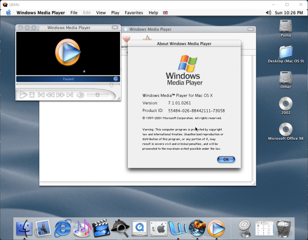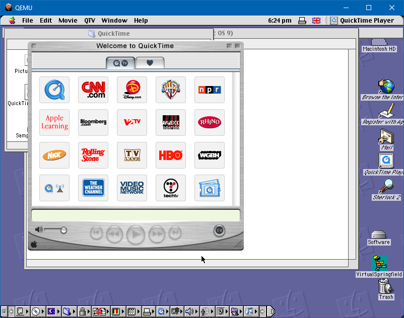 RealPlayer 7: Works but the title bar is glitched out, might be more to do with the PCem emulator or its graphics card (3DFX Voodoo Banshee)