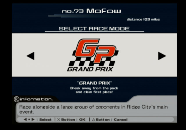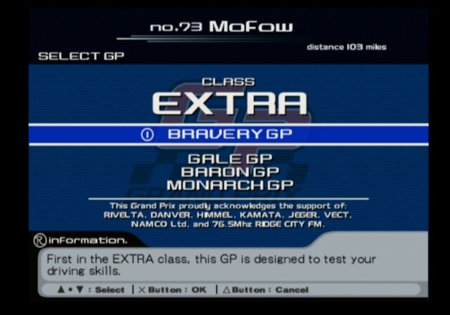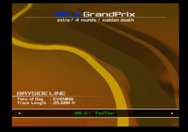 Extra Blast GP: This series uses a sudden death type of gameplay, where if the clock timer runs out, then you are ejected from the race. As you race you will pass through checkpoints which extend the time. If you are familiar with the arcade versions of Ridge racer this will seem familiar to you. For these races, you will still need to satisfy the qualifying rank to progress. Known as Gale Gp in normal, and Tornado GP on hard.