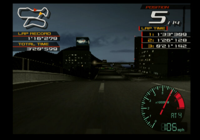 Some tracks can be raced at different times of day, such as Day, evening & night. Unlike the first Ridge racer game where the sun will set or rise during the race which results in a day/night cycle, The sky will remain constant through the race, giving the game a realistic passage of time. This is the case even with the 99 trial.