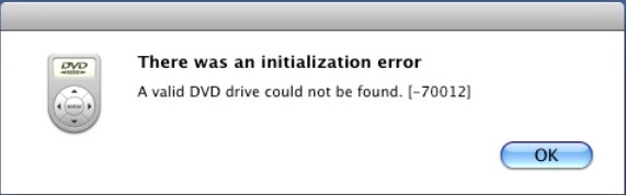 Leopard comes with a DVD player built in, and by connecting an external USB DVD drive we have the ability to play back DVD’s. Although for some reason it failed to detect my Dell external drive, even though it was connected to a powered USB hub port. The LG drive worked perfectly and OS X recognised a DVD movie was in the drive but refused to play it back with there error message below: