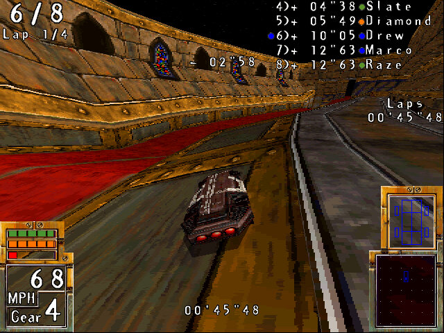Supported on most ATI RAGE cards with pre-2000 drivers, this version has texture warping on the outer walls of the track. Screens here were captured off a Dell OptiPlex GX1 with the ATi RAGE PRO TURBO onboard graphics.