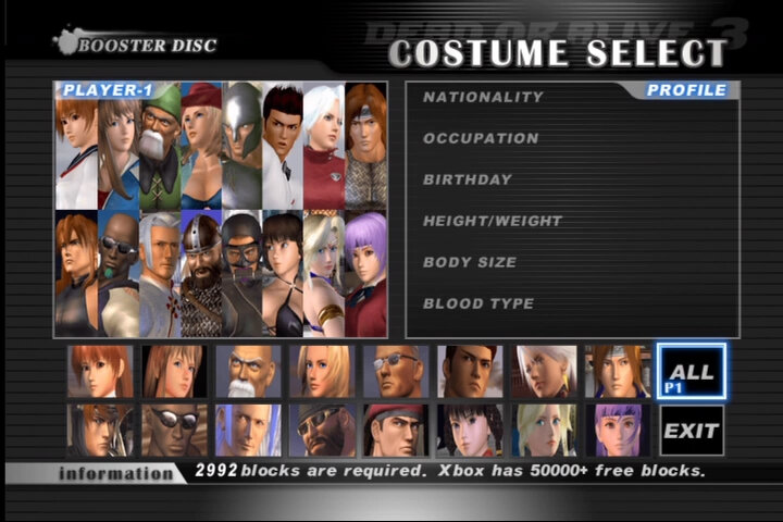 The North American version had a limited amount of costumes compared to the European and Japanese versions. Tecmo did release a Booster pack to add additional costumes to the game. This was provided by some of the OXM (Xbox Magazine) discs, and was also included with Dead Or Alive 2 Ultimate. Alternatively a copy can be obtained here.