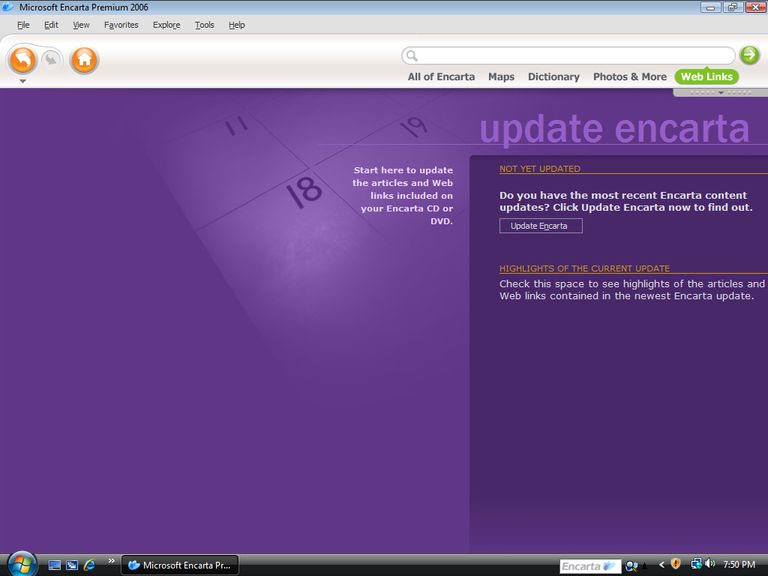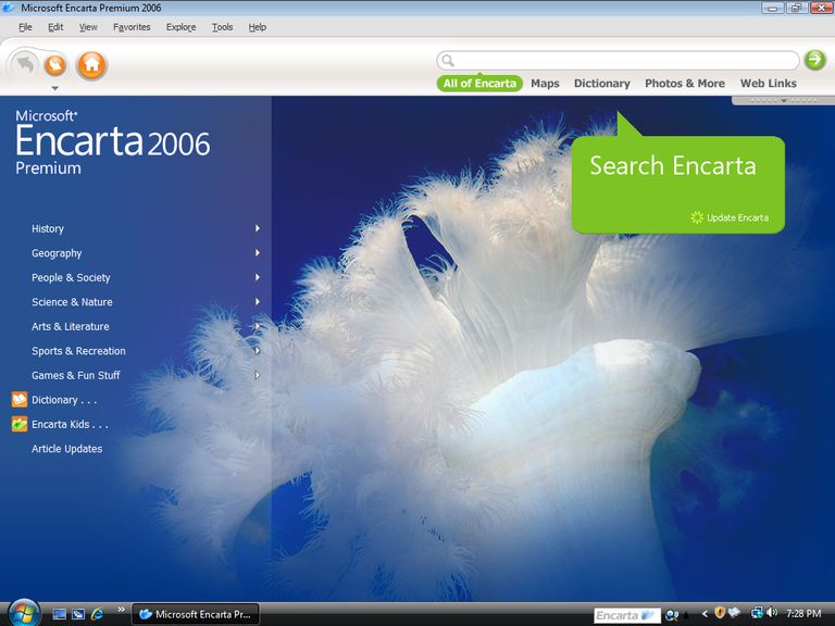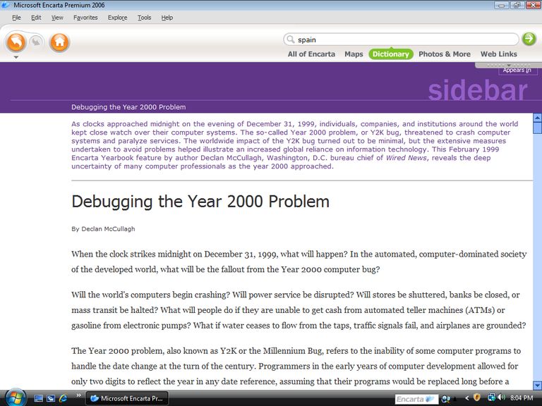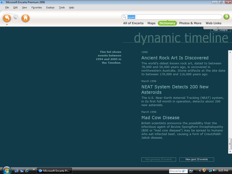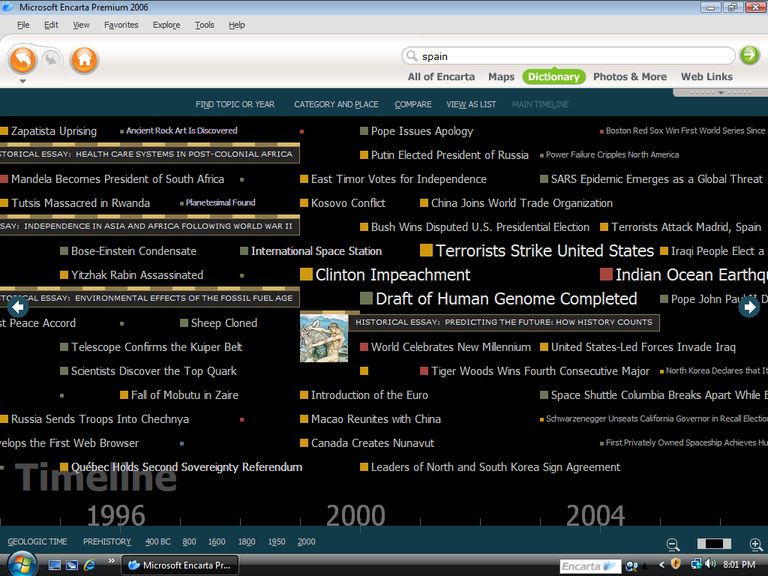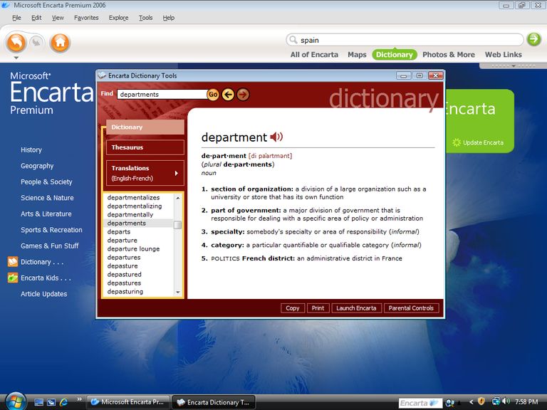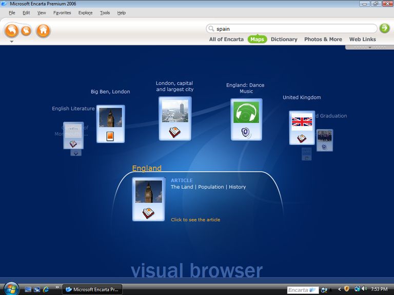 The search bar can be selected to search in specific subjects like the dictionary or maps. This is useful as the Encarta search can be fragmented,. Simply searching for Spain can yield results in relation to map/location and articles that relate to Spain itself.