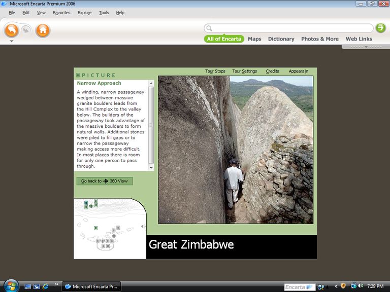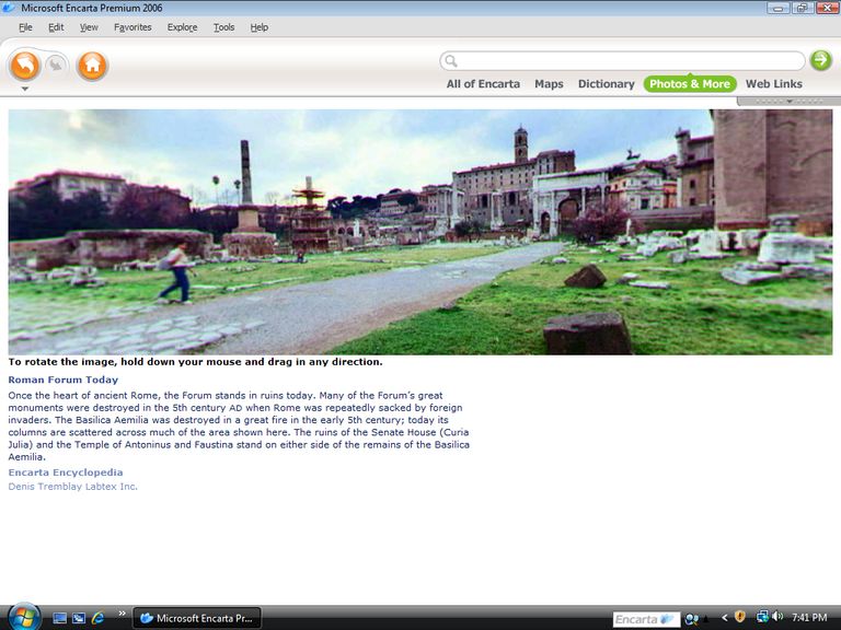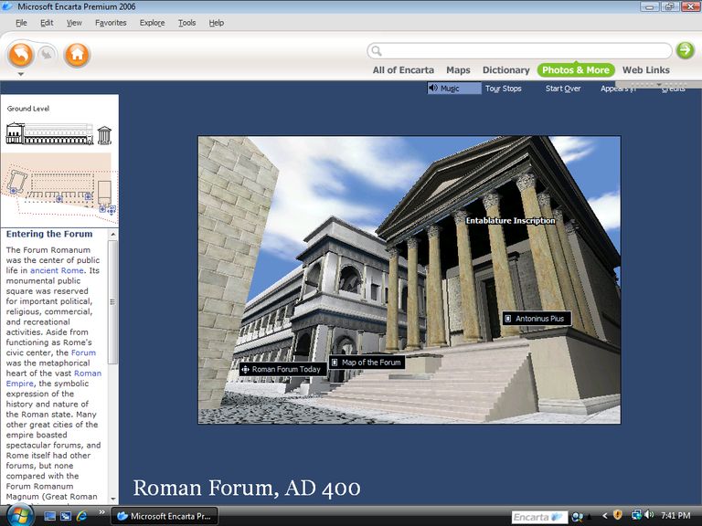 Microsoft Encarta 2006 featured 3D virtual tours as part of its multimedia enhancements, allowing users to explore reconstructed models of historical sites in an interactive, three-dimensional environment. This feature, introduced in Encarta 2002 and carried forward with minimal changes through later editions (including 2006), focused on ancient and historical landmarks to provide immersive educational experiences. You can navigate these tours using mouse controls to rotate views, zoom in on details, and access linked articles or hotspots for more information, albeit with the quality of early PlayStation graphics.