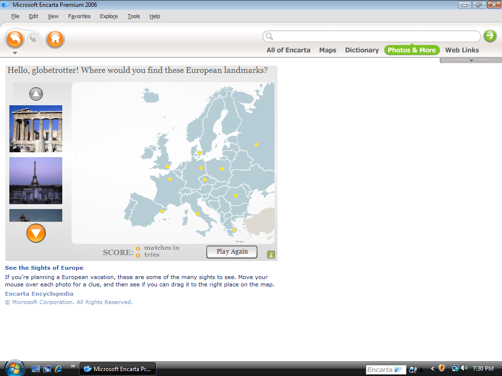 Encarta included a few educational games designed to make learning interactive and fun, primarily aimed at reinforcing encyclopedia content. These were not full-fledged video games but rather simple, knowledge-based activities integrated into the software. They are mostly powered by Flash and run within the Encarta program. Many of these consist of quizzes and puzzle’s.