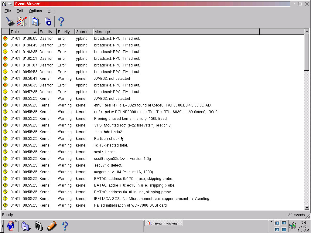 Event Viewer: Similar to the Windows event viewer, shows any issues or events logged with the system. Very useful for troubleshooting, here it found that the AWE32 soundcard was not being detected properly.