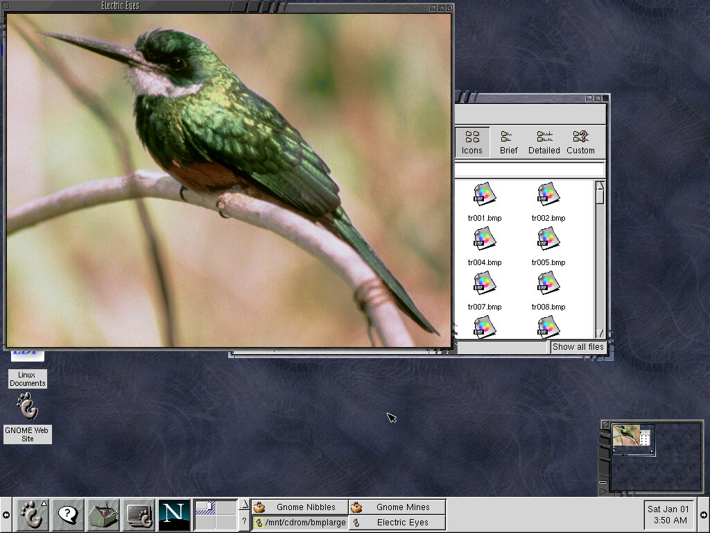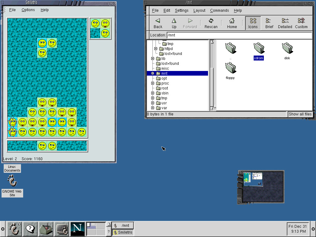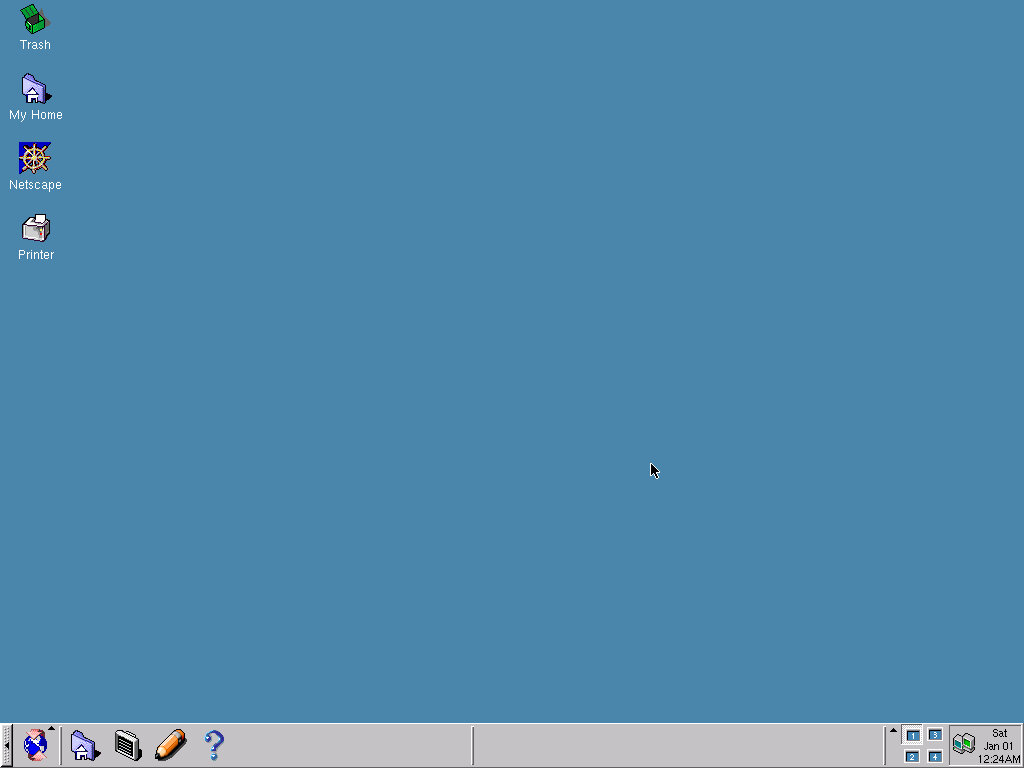 The second icon is your help button, with brings up the Gnome help browser, which looks similar to a standard HTML browser, not like the Windows 98 help. The third icon is the GNOME configuration, which will host settings in relation to GNOME itself. Here you can change elements like the desktop background or the default window manager, which by default is Enlightenment. To a regular user, this might seem confusing as coming from Windows you are going to be familiar with the concept of Windows Explorer, which aces as the file explorer and window manager. But in Linux, this has been outsourced to various different components. Whilst this is supposed to give a lot of flexibility, it is generally considered to be a lot more confusing, and in the end is just another component that could go wrong, what happens if a window manager isn’t fully compatible? Lastly are the icons for the terminal (You’re gonna be using this a lot in Linux) and Netscape internet browser, and an icon for organizing multiple desktops. You can hide the bottom bar by clicking either the left or right arrow buttons, which will slide the taskbar away. You can then unhide by clicking on the same button Overall it’s quite a nice feature-packed environment, not ideal for the basic user but for those who have an advanced workflow, I can understand why some people would prefer this environment.