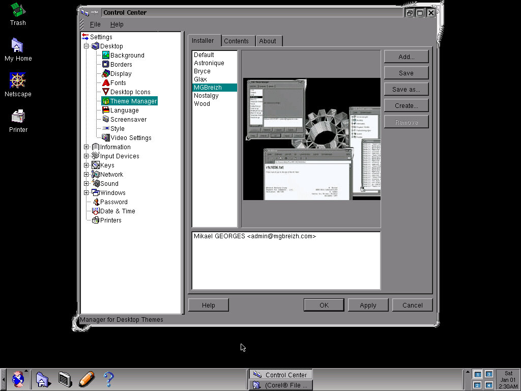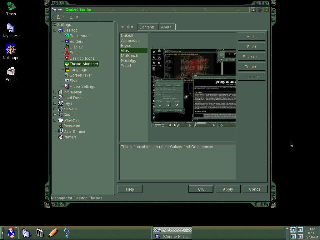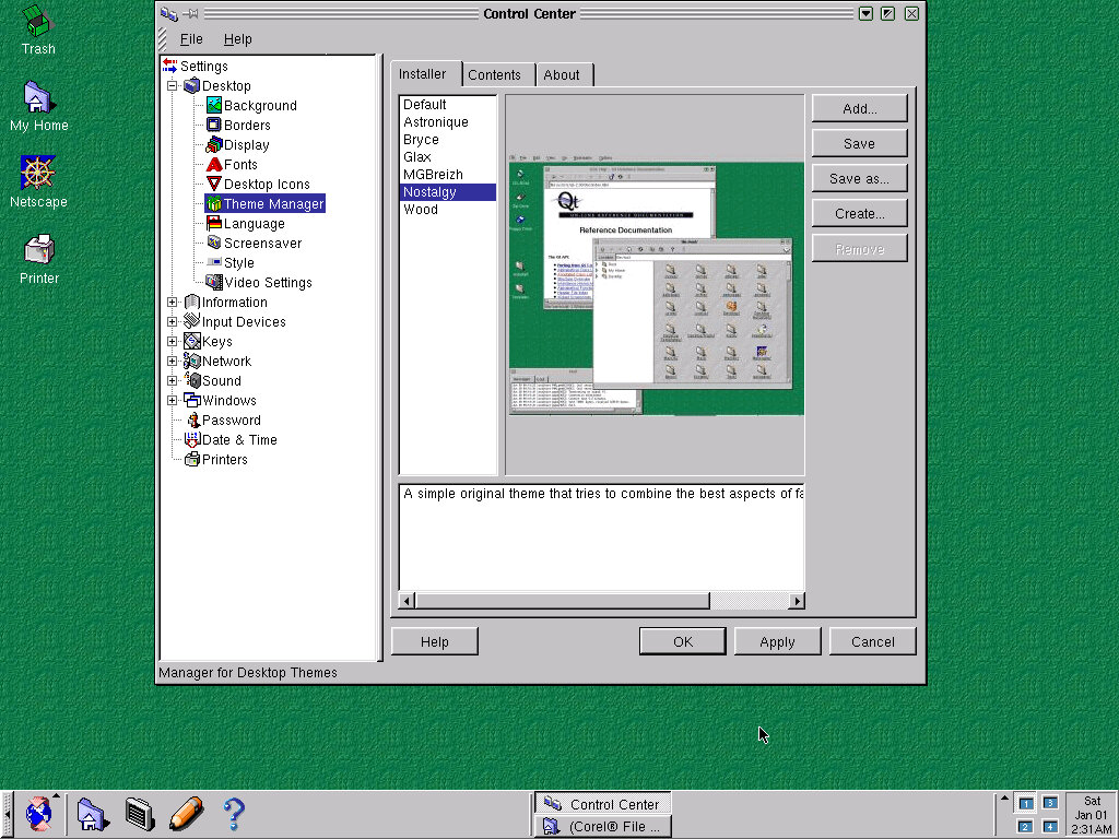 There’s a variety of themes to choose from they add style to the windows, taskbar and background image. You can also stick with the default theme, and just use a different preset colour scheme, or you can modify the individual colours themselves. There are also system sounds, but I could not get the soundcard to function in this operating system.
