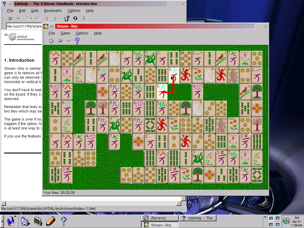 Shisen-Sho (kshisen 1.1): Looks like Mahjong, objective is to move pairs of matching pattens/tiles that are on the same line, within 3 spaces of each other