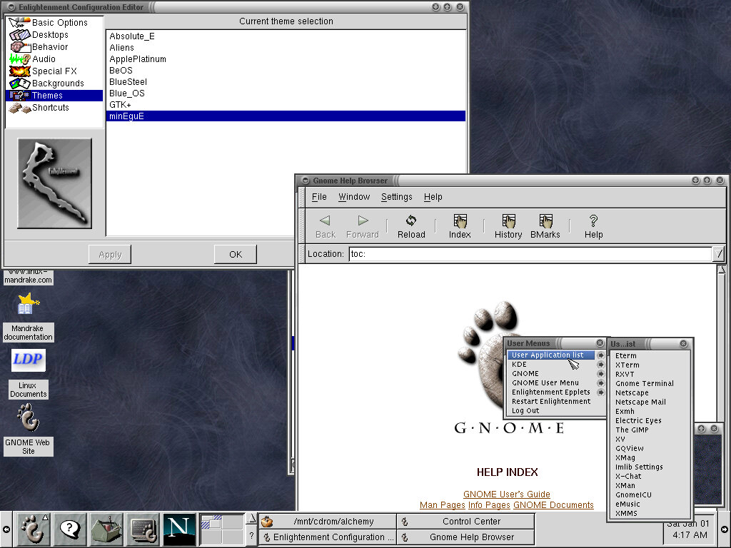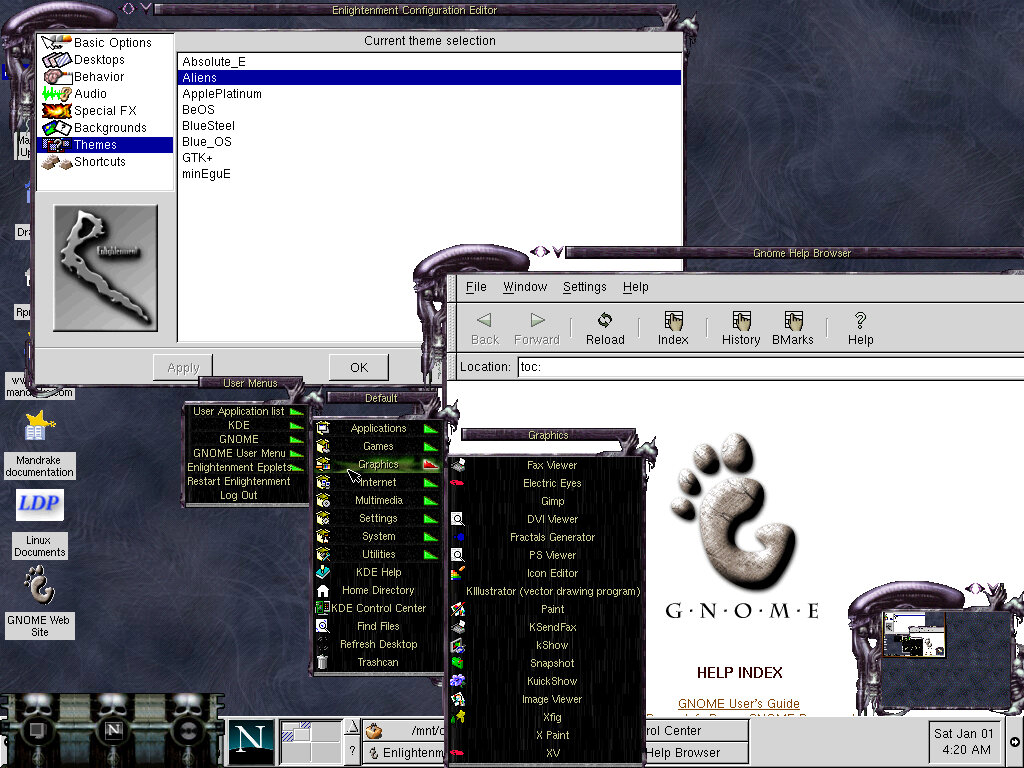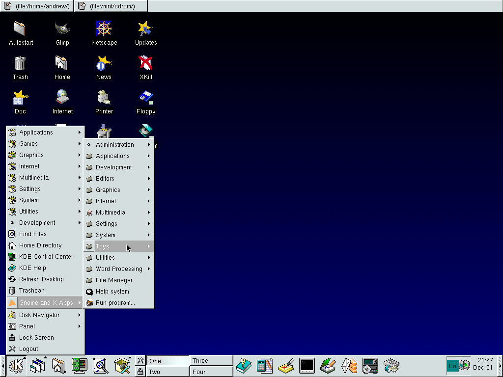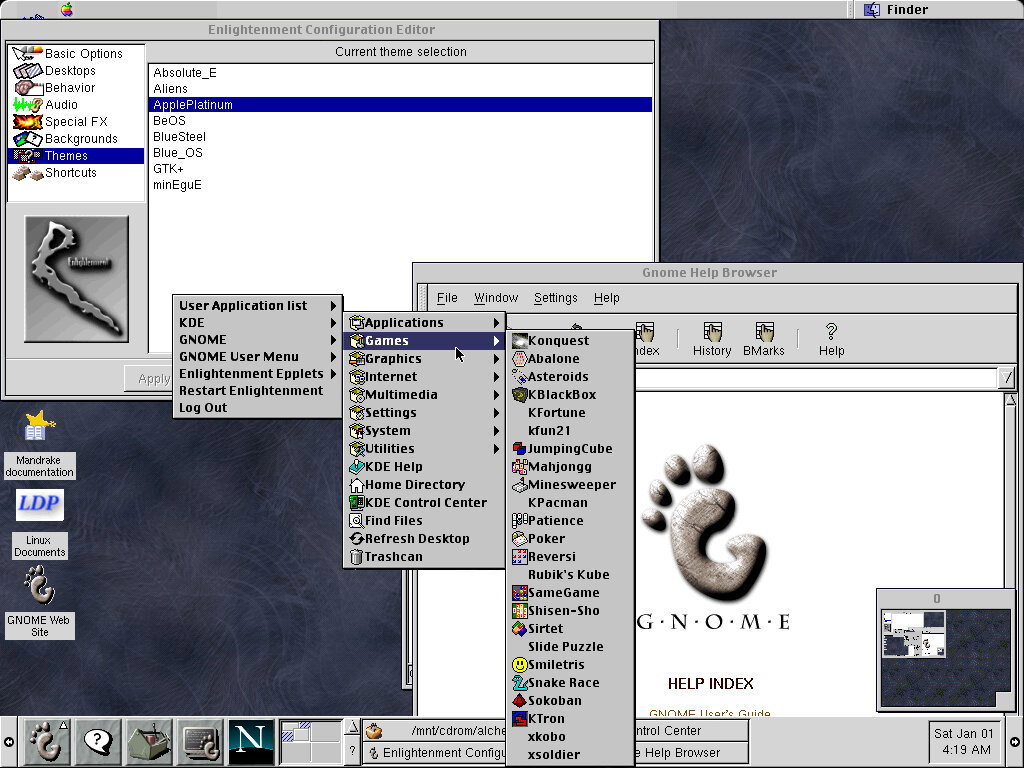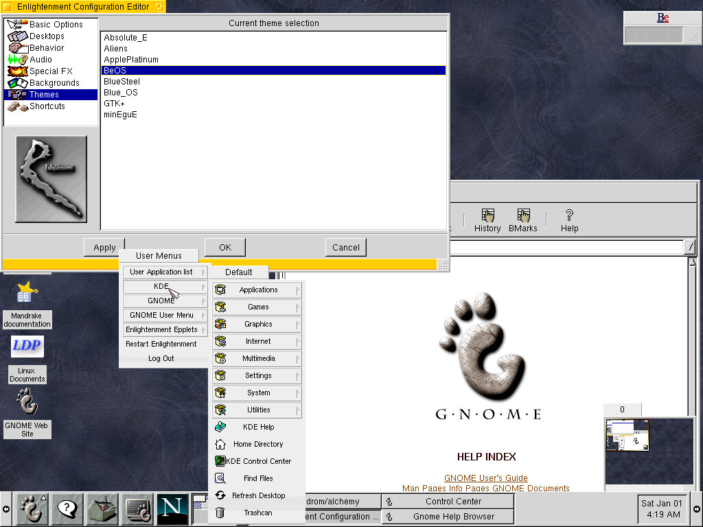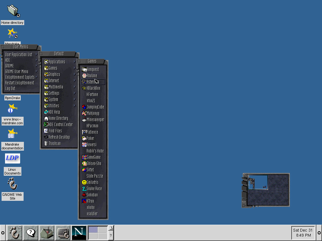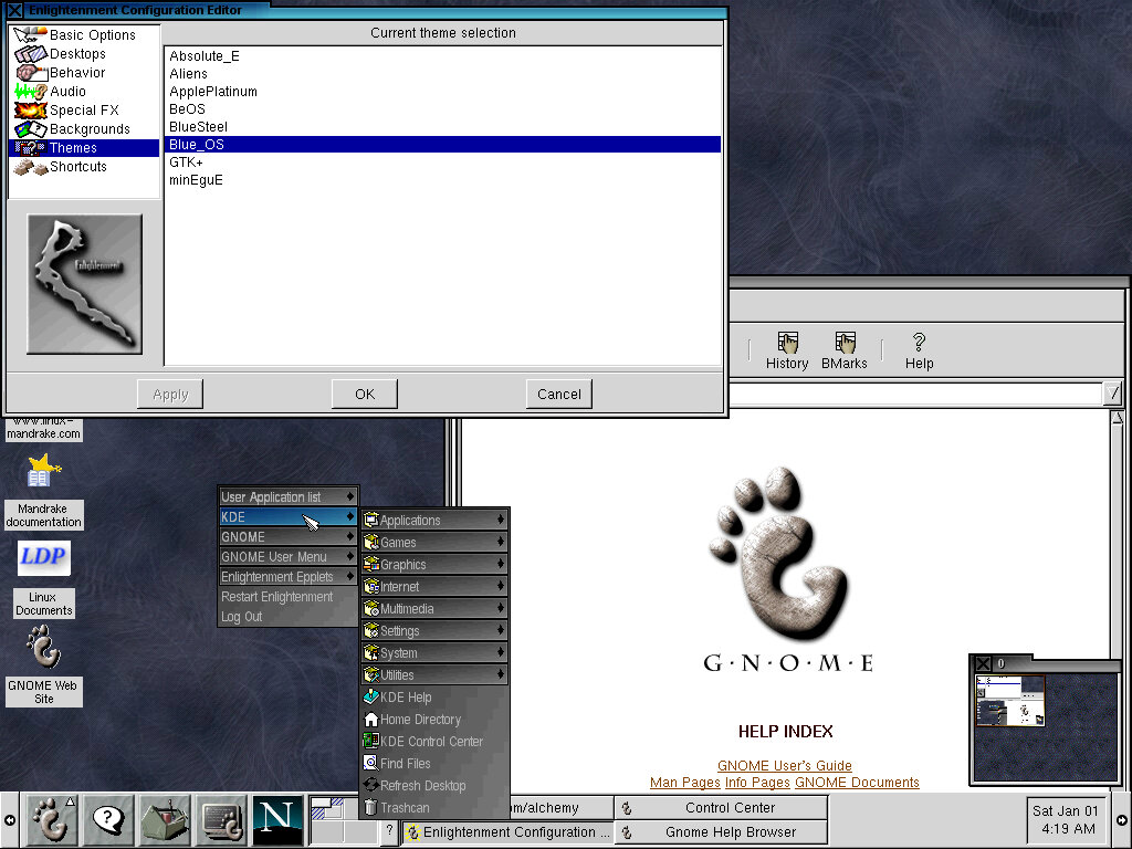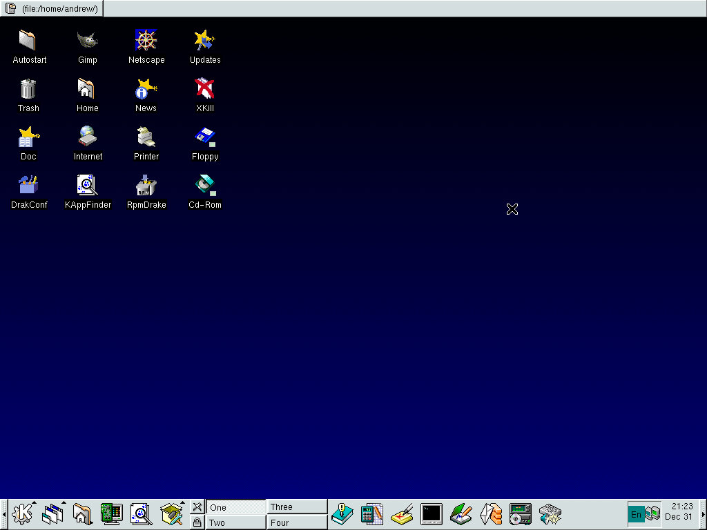One of the desktop environments, this bares a lot in similarity to Microsoft Windows of the era, which isn’t a bad thing and can be customized once you are used to the mandrake interface. Here you have your standard taskbar with a set of icons, the first (Which looks like a foot) brings up a Start-like menu with a list of different applications installed
