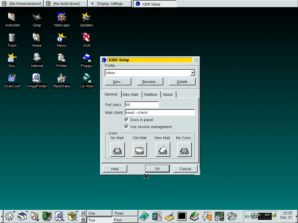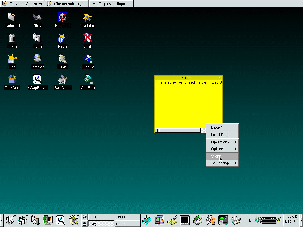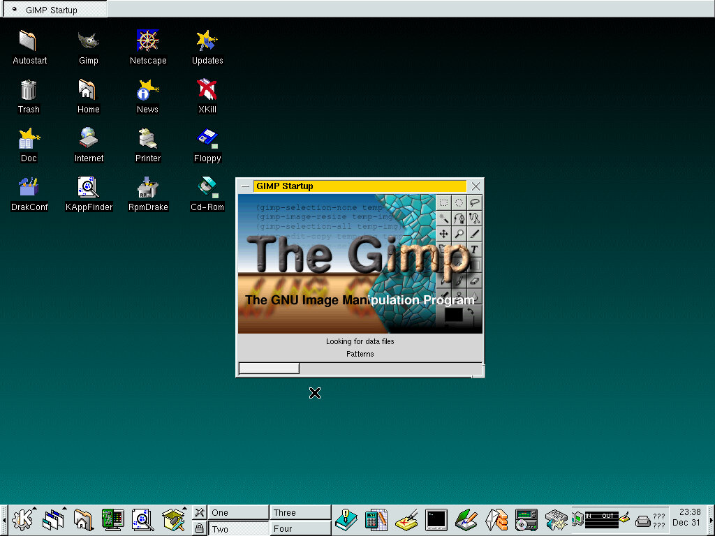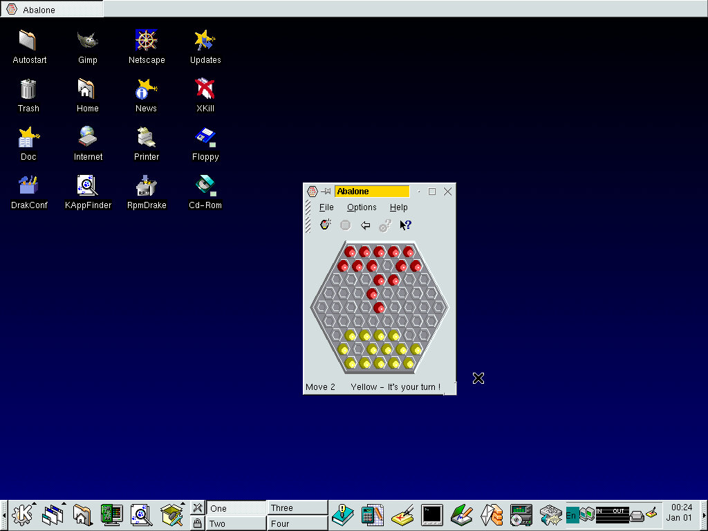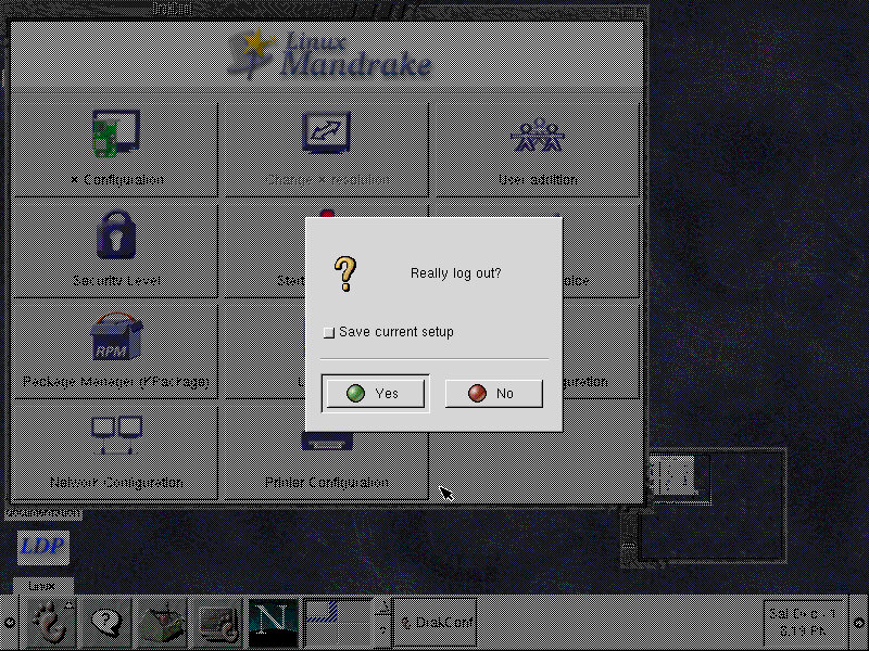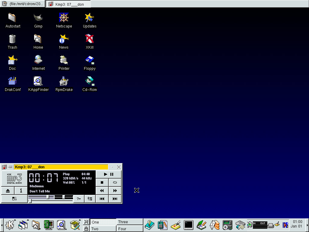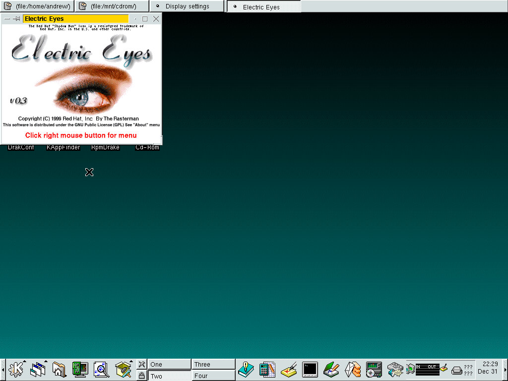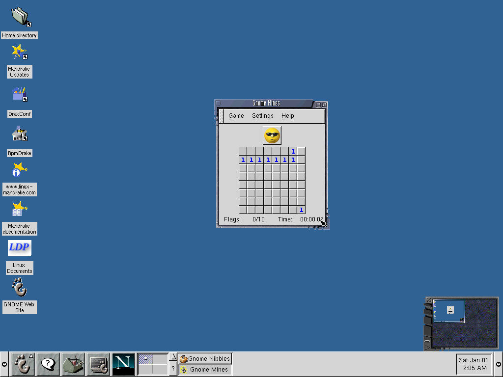 One of the desktop environments, this bares a lot in similarity to Microsoft Windows of the era, which isn’t a bad thing and can be customized once you are used to the mandrake interface. Here you have your standard taskbar with a set of icons, the first (Which looks like a foot) brings up a Start-like menu with a list of different applications installed