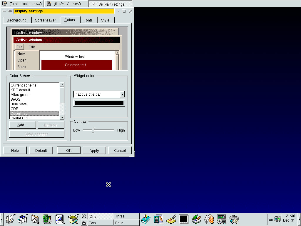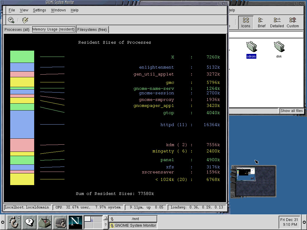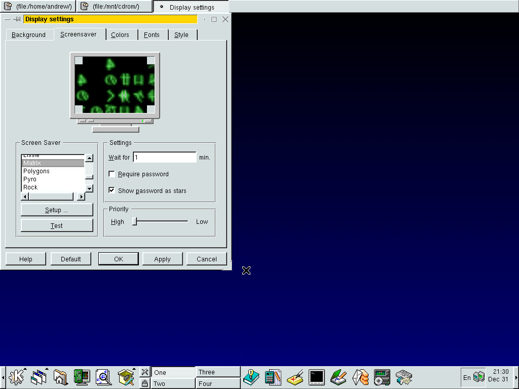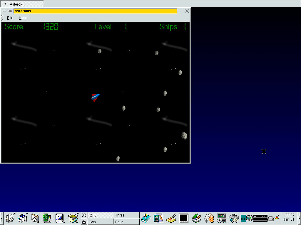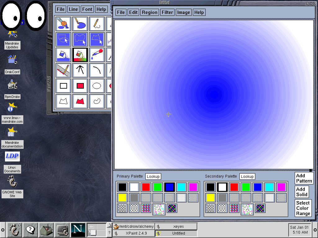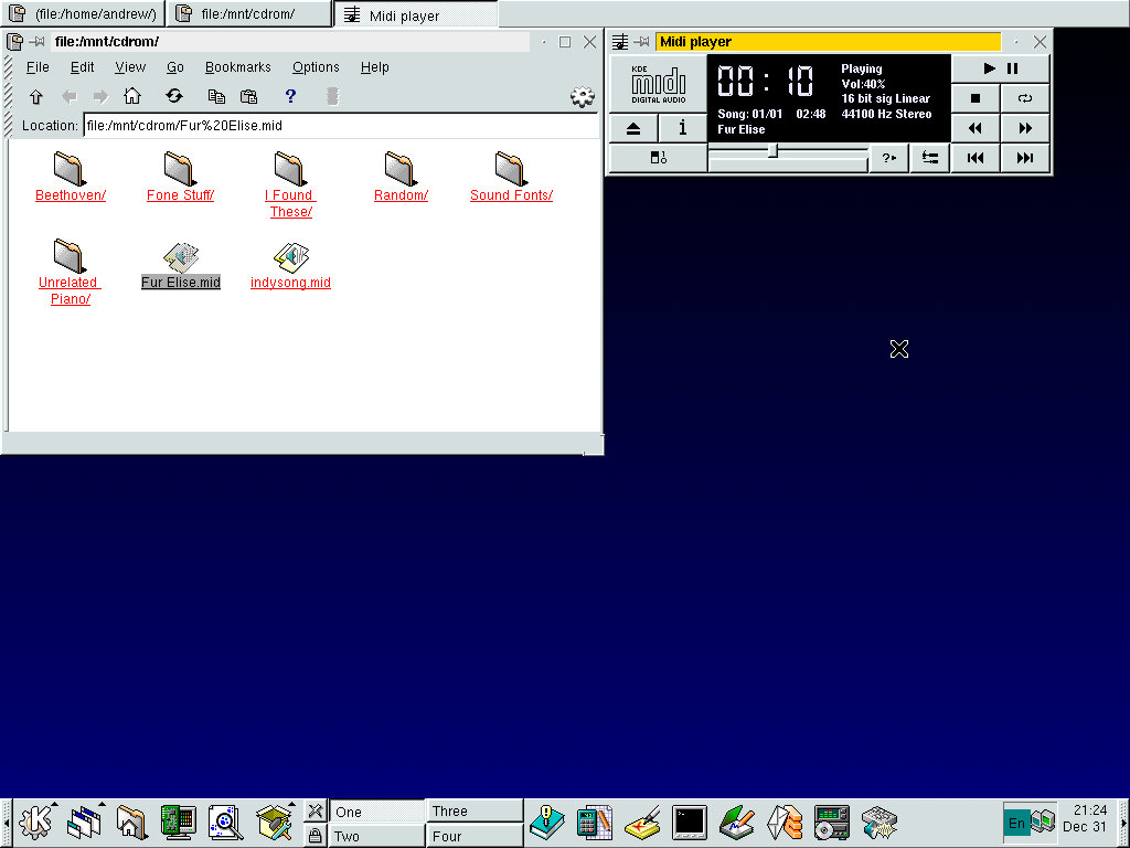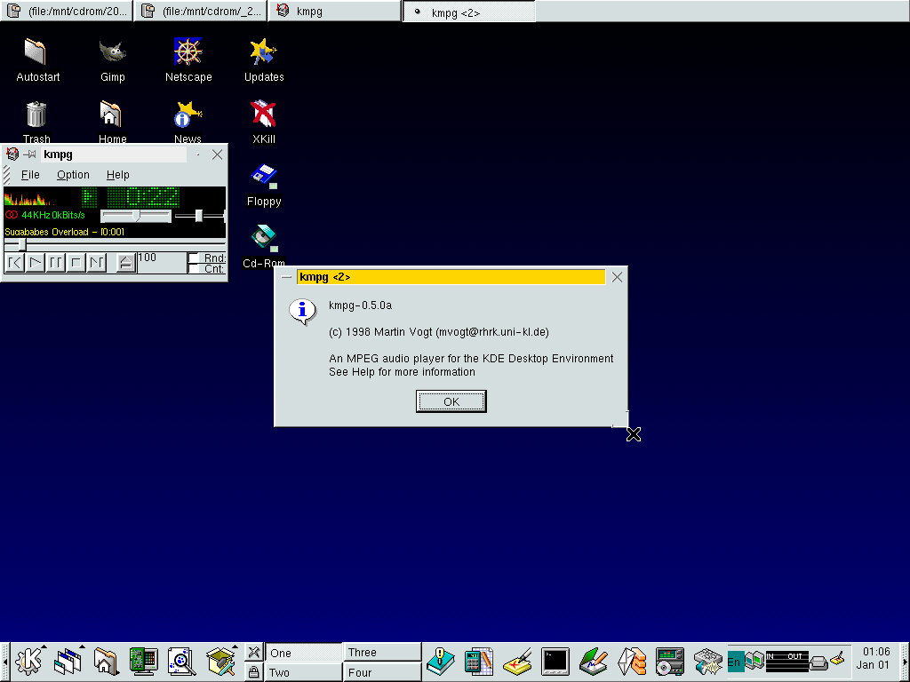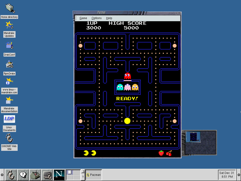 One of the desktop environments, this bares a lot in similarity to Microsoft Windows of the era, which isn’t a bad thing and can be customized once you are used to the mandrake interface. Here you have your standard taskbar with a set of icons, the first (Which looks like a foot) brings up a Start-like menu with a list of different applications installed