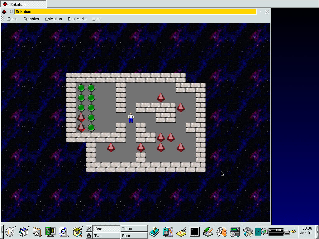 Sokiban (ksokoban 0.2.2) A game where you have to push the diamonds into the correct holes in order to progress to the next level. Same as what was included in Mandrake 7.