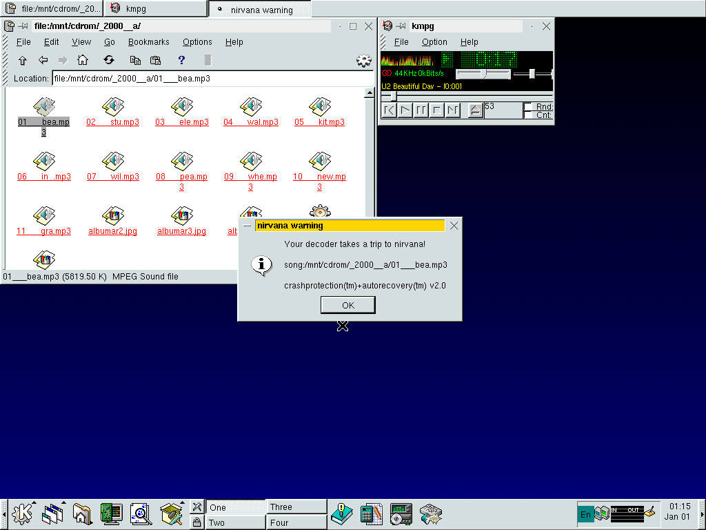 kmpg (Audio MPEG Player) – This one was unreliable, some files would playback albeit in a garbled form, sometimes it would playback just fine. Also occasionally throws an error message that your decoder has gone to nirvana, Kurt Kobain has my decoder?