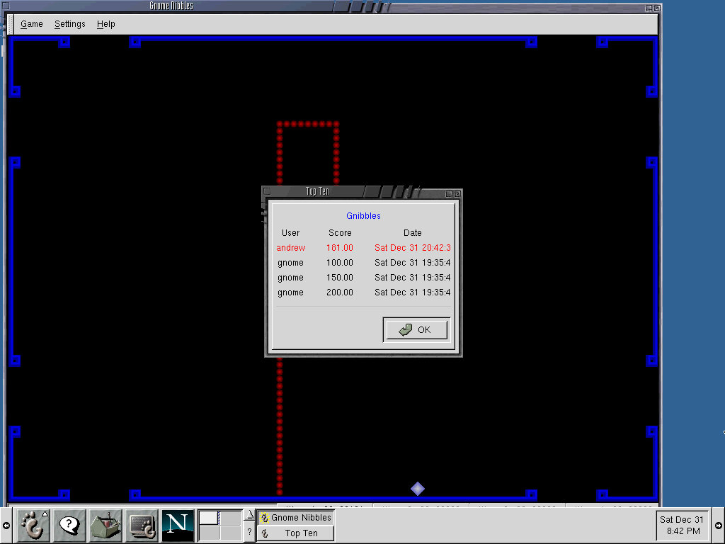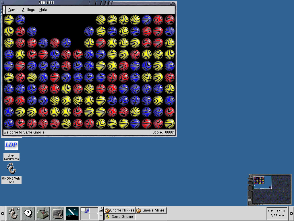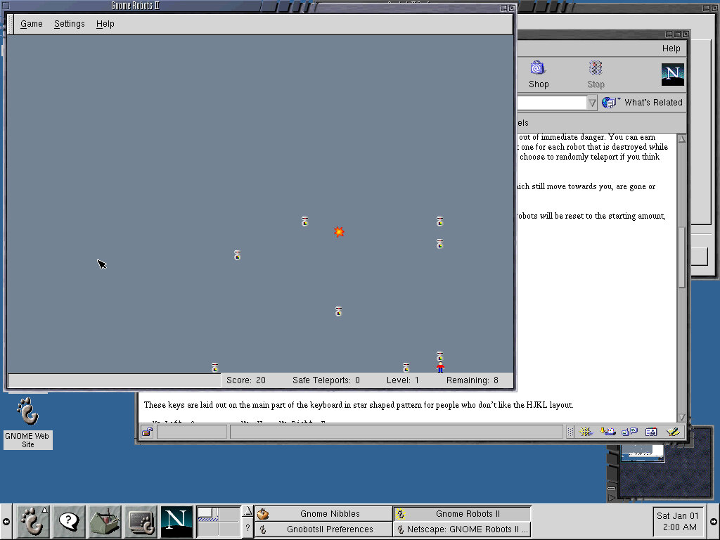 GnobotsII: An interesting game with bizarre movement controls, here you have to move in a certain direction to avoid the enemy robots from killing you. The controls are a pain here since they are mapped bizarrely on the keyboard, i.e Y is up and left, N is right and down, L moves you right. Help file loads in Netscape browser, and is written using size 8 font making it difficult to read