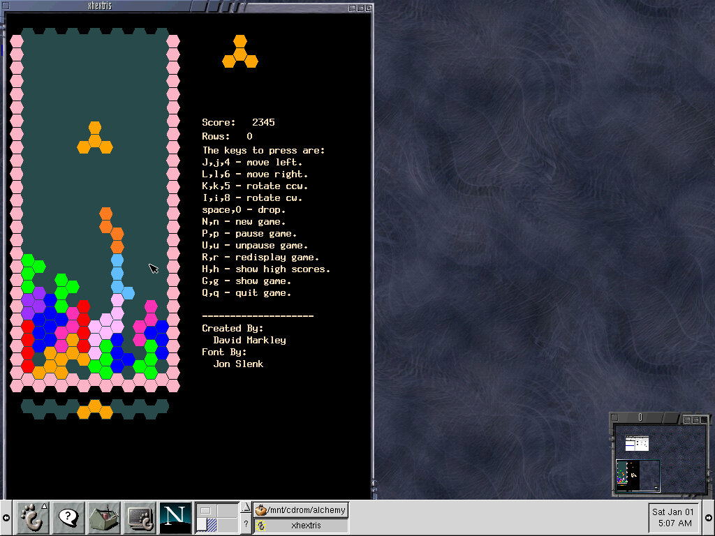xhextris: Not Tetris, HEXtris played with hexagon symbols using another weird keyboard layout, you have to use J to move left and L to move right, instead of using the keyboard arrow keys or WASD