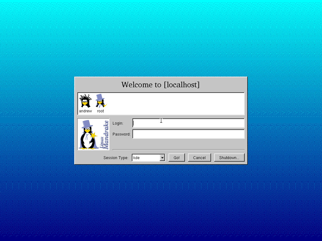 Once booted, you will be at the login screen, remember the username and password you set up earlier, you have to enter it manually here, there are no username icons to click like in Windows XP or Mac OS 9. From here you can choose the desktop environment, two common options are KDE and GNOME that you will recognize from modern Linux distros, but a few others exist also. I recommend KDE, as GNOME & Enlightment looks more like a mid-90s RTS game in this distro. Enlihtmetnt also shows up in GNOME. First time logging in will be a bit slow as Mandrake tries to prepare the desktop, or workspace as Linux calls it.