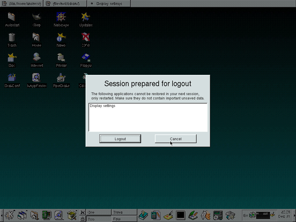 Like other KDS distros of the time, you need to log out of the current user first before you can shut down the system. If ACPI is supported by the motherboard, the system will turn off.