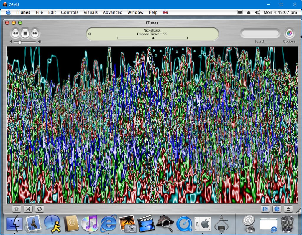 Sound: Works somewhat if you use the screamer audio builds from emaculation. It’s not very good quality audio with stuttering and crackling when playing mp3 audio via iTunes (This might have more to do with the emulated CPU running at 200MHz. Eventually the sound just gave up one time and I had to reboot the OS to get it back.