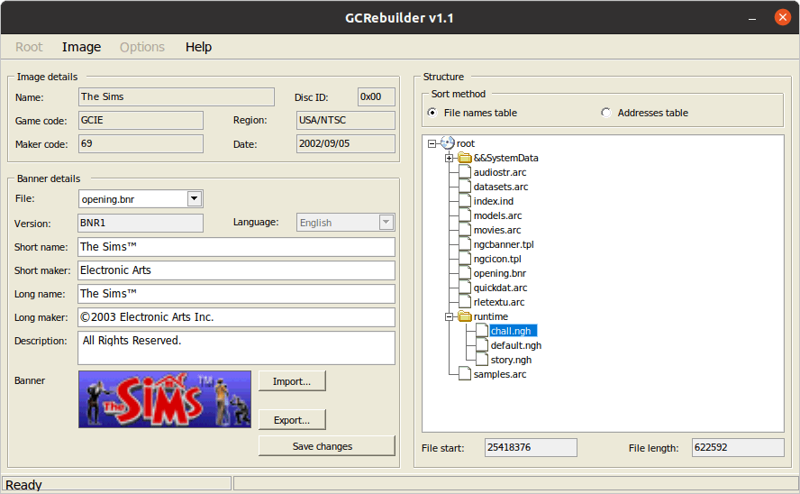Looking on the Gamecube disc there is a Runtime folder that holds data for the default neighbourhoods, along with the sims, lots, and occupied objects (but not the objects themselves, or the skins, wall or floors). At first I assumed this was where the game pulls the default neighbourhood data from when creating an new memory card file, and would act as a template, however closely inspecting a batch files, it seems this folder is used to create the .ngh file which is kind of like a zip or cab archive of the above folders. The runtime folder is not present on the Xbox or Playstation 2 versions, but the ngh files are.