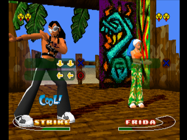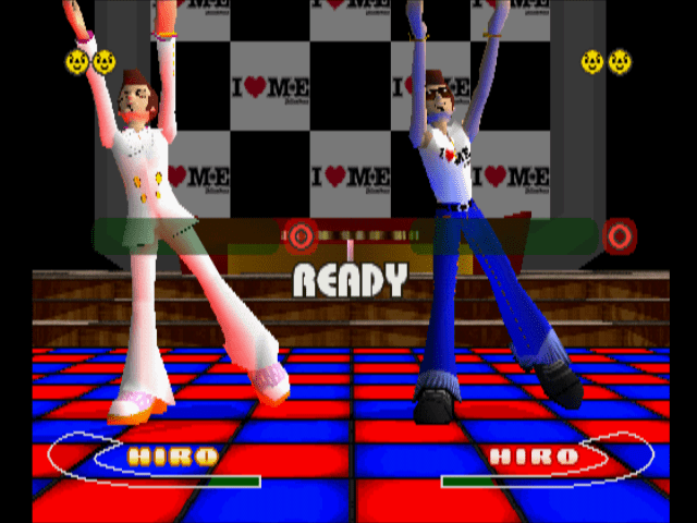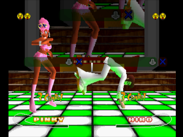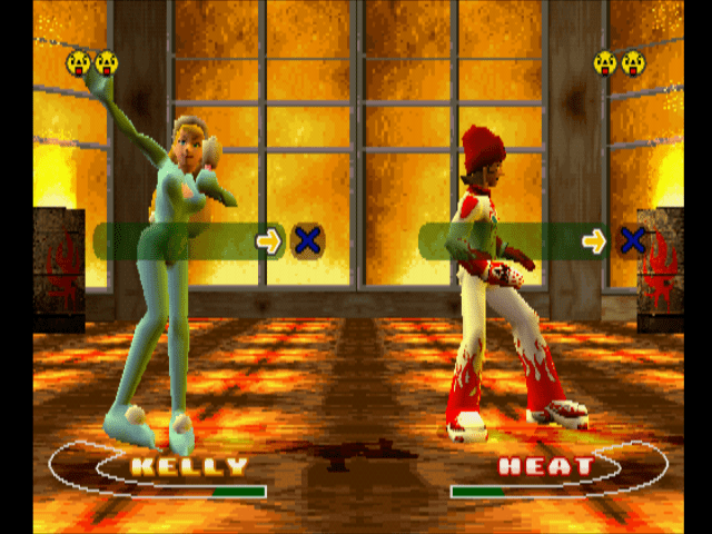 The game is played by monitoring the beats within rhythm, there are four beats. You press the directional buttons and on the fourth beat you press either the Circle or Square button to execute your character dance move. Whilst this seems easy a lot of the timing is based on the current song being played, and on some songs this can be difficult (Like Kelly’s stage, which is at a slower BPM than the other songs) Timing is crucial and on some emulators its hard to play the game because the delay in response makes it near impossible to play. This is something to consider when playing on a system that has wireless controllers. You can look at the two faces icons at the top left or right of the screen for an idea of which beat you are on. The green bar that shows the buttons to enter also flash to indicate the beat.