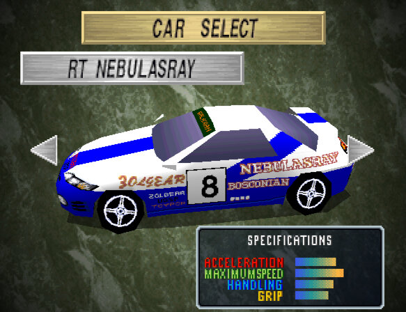 Unlike the previous games in the Ridge Racer series, cars are handled differently with you only starting from one car, instead of four being available. When more races are completed, credit are awarded which allow you to spend them on buying new cars or upgrading your existing car, which will be required in order for you to progress though the next class of GP. Different cars have different specifications, with some having better handling, acceleration or top speed. Some of the later cars are in manual transmission only which requires you to manually change and shift gears.