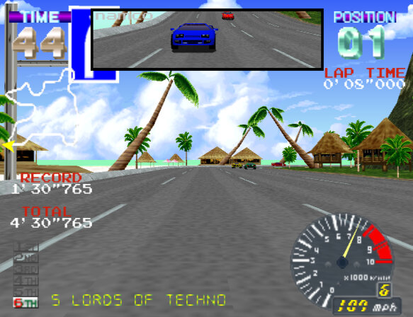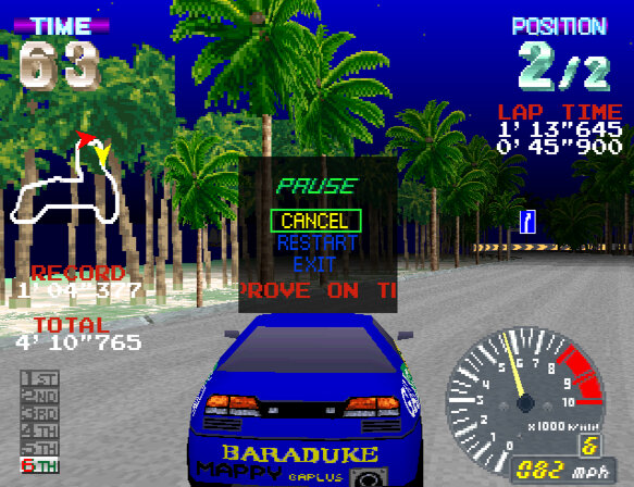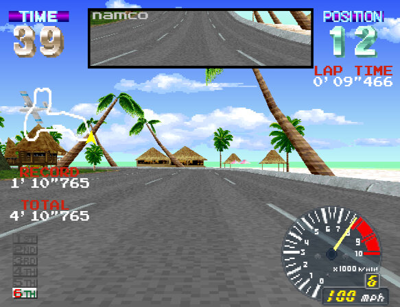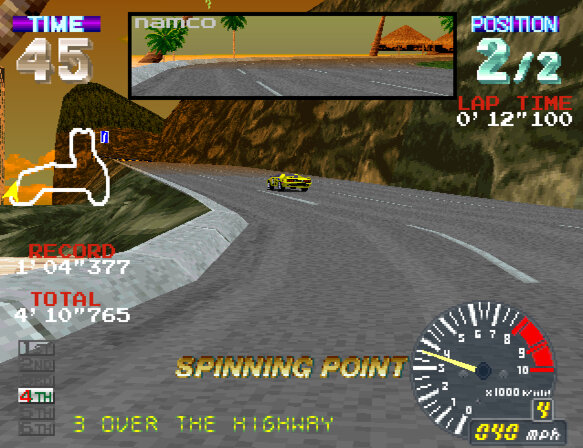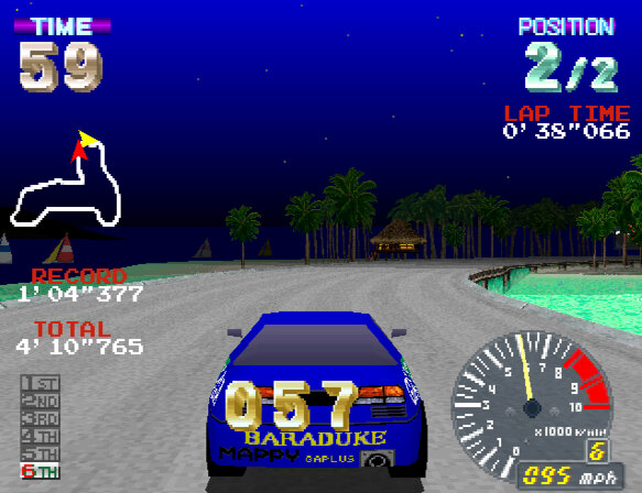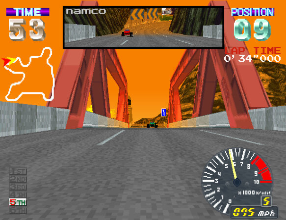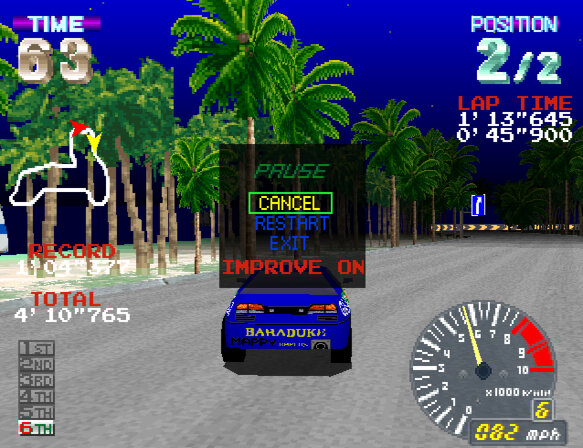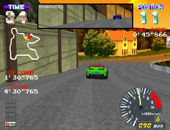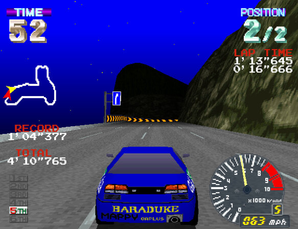 To keep a stable 30FPS, which was the game’s target framerate, certain changes are made to the enemy opponents, where you only have up to 4 cars on screen at the same time, of which the AI-controlled cars are more spread out across the track. In contrast to the early titles where you will pass multiple cars in the same area, in R4 the opponents feel spaced out and you pass by them in a linear fashion.