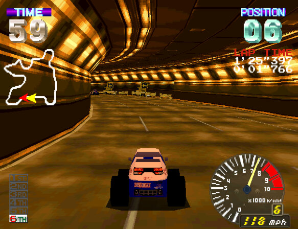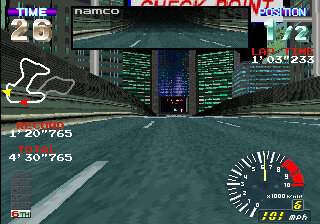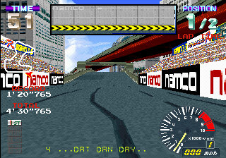 Despite this, you get a good feel of the Ridge Racer city, Some tracks can be raced at different times of day, such as Day, evening & night. Unlike the first Ridge racer game where the sun will set or rise during the race which results in a day/night cycle, The sky will remain constant through the race, giving the game a realistic passage of time. This is the case even with the 99 trial.