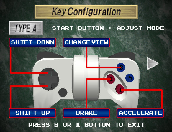 For analogue control the NeGcon controller can be used for more precise turns, as this game predates the release of the dual-analogue controller. The menu controls are awkward to control compared to traditional PlayStation games, as you have to press the start button to confirm/enter menus rather than using the X button that most other games use.