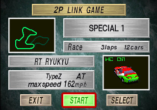 The regular VS mode can also be accessed by having two controllers connected to the console, where the game plays in a split-screen mode allowing for both racers to race at the same time through one console. You can combine this with the link battle to have a total of four players in a single race, with two players per console.