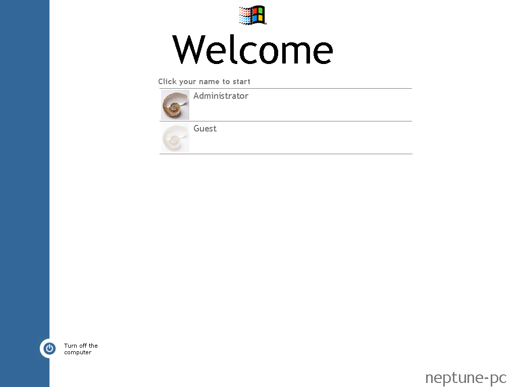 Logon screen with a user account displayed, again very similar to XP but with a different colour scheme.