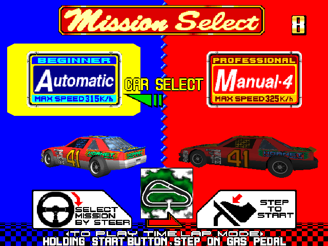 For analogue control the NeGcon controller can be used for more precise turns, as this game predates the release of the dual-analogue controller. The menu controls are awkward to control compared to traditional PlayStation games, as you have to press the start button to confirm/enter menus rather than using the X button that most other games use.