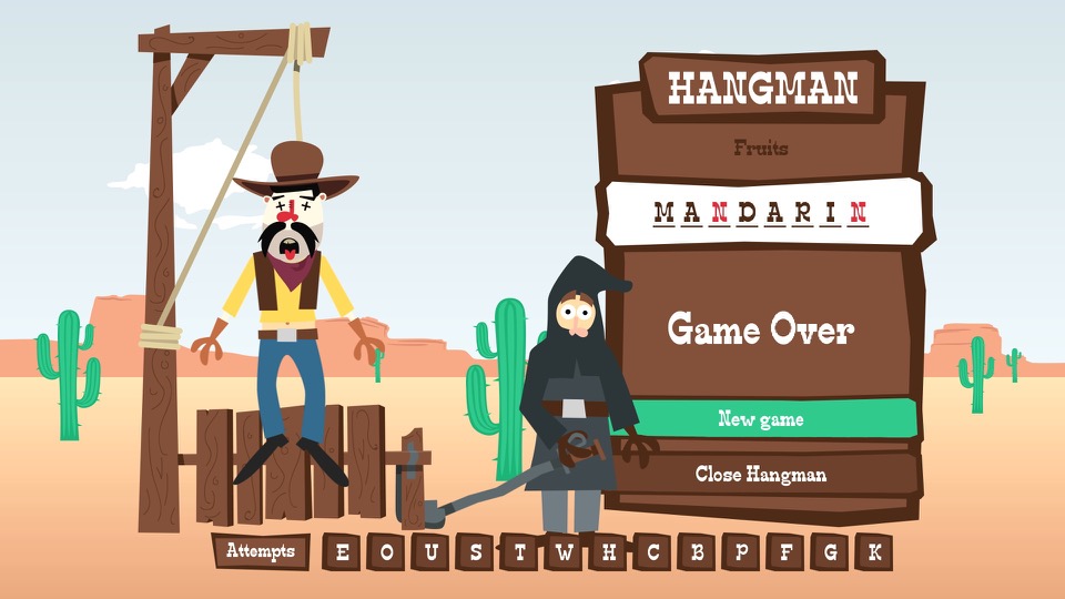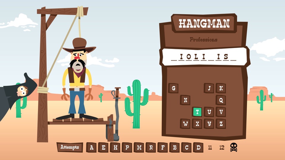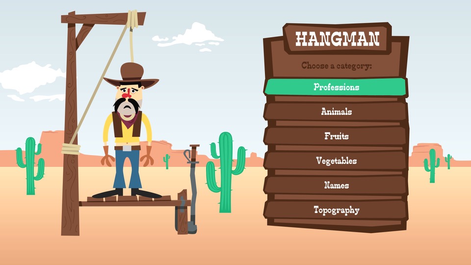 A simple game of hangman where you have to guess the correct word. You can choose from a list of different categories (Professions, Animals, Fruits, Vegetables, etc).